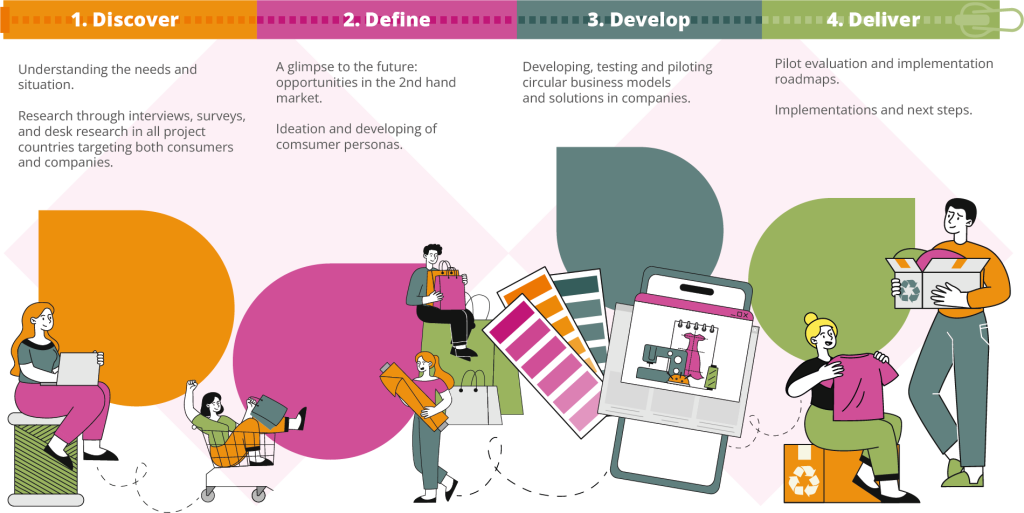 In the final “deliver” phase, nine projects were implemented. These contributed to new business opportunities that supported all three goals of the Baltic2hand project: increasing reuse, decreasing consumption, and decreasing textile waste (Pic 2).